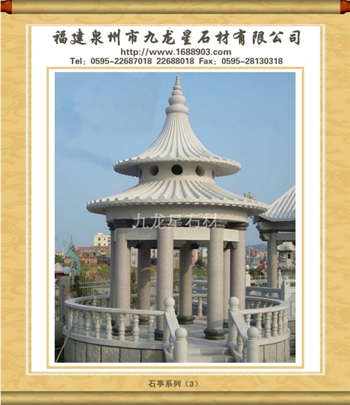 2、石雕涼亭大小要與園林、住宅大小匹配,距離要合適,形狀應以圓形、方形、五角、六角以及八角為主,忌奇形怪狀者。