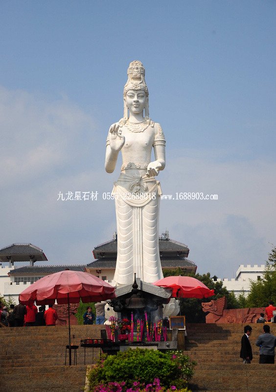 在云南福星廣場(chǎng)的正中矗立著一尊高達(dá)17.56米的漢白玉觀音雕像。該像共由269塊漢白玉構(gòu)成,重約400噸,具有“端莊、肅穆、神奇、美慧”等造型藝術(shù)特征。觀音像的兩臺(tái)基座(蓮花座和須彌座)分別高2米和1.2米,觀音像高14.36米,系目前世界上最高的一尊漢白玉觀音雕像。