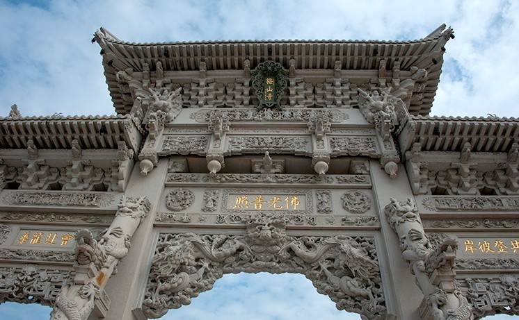 百余名惠安石雕師傅歷時(shí)兩年雕刻完工。梅山寺石質(zhì)山門總高度23米,寬23.6米,全部由花崗巖石雕刻而成,四柱三門結(jié)構(gòu),大型山門總石方用量達(dá)680多立方米,居我國(guó)現(xiàn)有石質(zhì)山門中石方用量之首。山門雕刻工藝高超,其復(fù)雜程度和難度全國(guó)罕見。斗拱采用的是整塊石材,